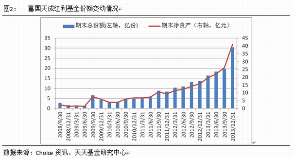 富国天成红利2013年四季度规模大幅增加,期间共申购13.01亿份,赎回2.31亿份,净申购10.70亿份,期末剩余总份额30.48亿份,较上季度增加54.09%,期末净资产为40.97亿元,较上季度增加56.94%。