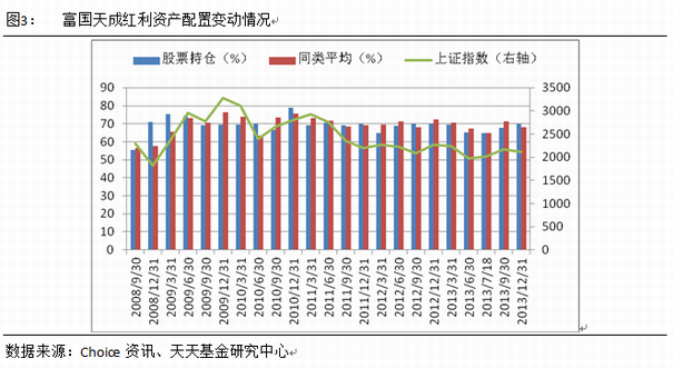 2013年四季度富国天成红利小幅加仓,基金股票仓位水平与混合型基金平均水平基本持平。截止2013-12-31,基金股票资产占净资产比例为69.96%,较上季度增加2.30%。(数据来源:Choice资讯)