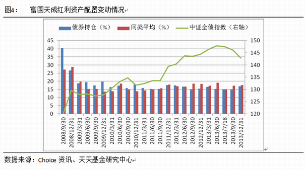 2013年四季度富国天成红利小幅加仓,基金股票仓位水平与混合型基金平均水平基本持平。截止2013-12-31,基金股票资产占净资产比例为69.96%,较上季度增加2.30%。债券资产占净资产比例为16.92%,较上季度增加2.07%。四季度基金加大了金融债、可转债、企业债的配置比例,降低了国债配置比例。