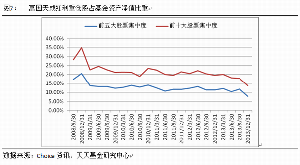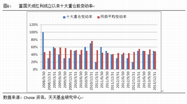 基金经理于江勇先生操作风格较为稳健,长期来看换手率不高,2013年四季度重仓股变动率为50%,同期混合型平均为48.58%。(数据来源:Choice资讯)