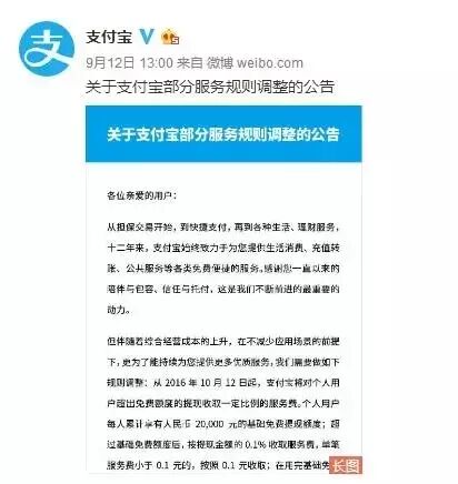 今天起,支付宝正式提现收费了!根据支付宝微博的公告,10月12日起,支付宝将对个人用户超过免费额度的提现收取0.1%的服务费。那关键问题来了,有什么方法能够不受手续费影响呢?一起看看!