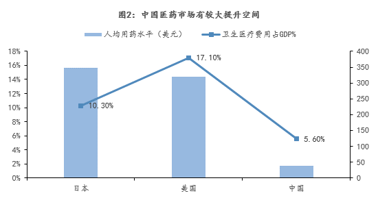 中国医药市场潜力巨大。目前中国医药市场规模已经超过日本,成为全球第二,但是从医疗卫生投入和人均用药水平上,中国与发达国家差距较大。2014年,中国医疗卫生费用占GDP的5.6%,而美国是17.1%。中国人均用药水平不足40美元,而美国和日本均超过300美元。受益于人口结构老龄化、疾病负担能力增强、健康意识提高等需求增长,医保体系的进一步完善需求释放,政策支持生物医药产业发展等因素,未来中国医药市场有望继续保持稳定增长。