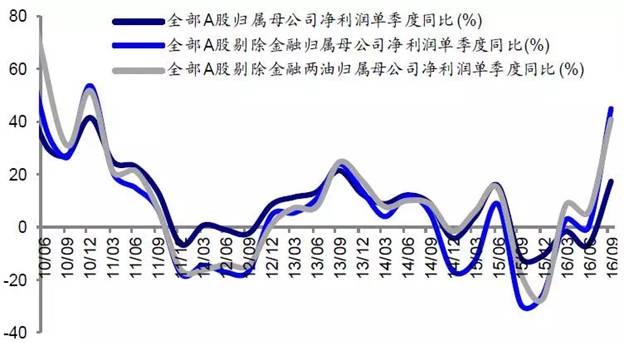 据统计,全部A股三季度净利润累计同比相较前两季度均有大幅提升。为了剔除基数效应,我们直接拿16年与14年同期比较并作年化处理,处理后仍表明三季度A股利润增速仍有好转迹象。如海通证券荀玉根所说,A股盈利处于筑底阶段。