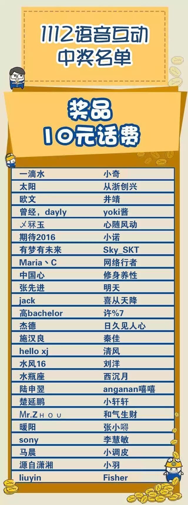 所有中奖的话费将于11月18日(本周五)前充值到中奖客官的手机账户中,请各位客官耐心等待~