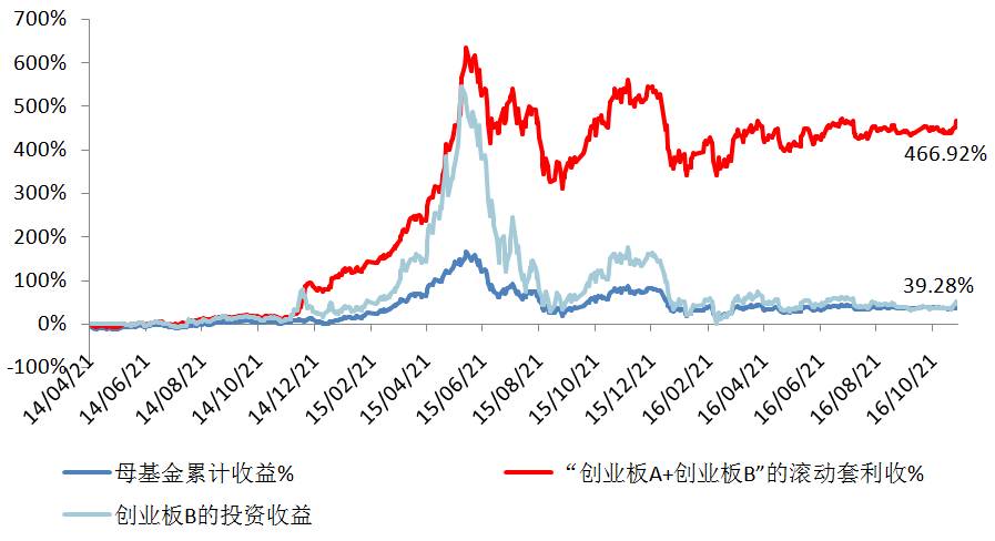 b. 套利确实需要赚指数的钱,也需要承担指数下跌的风险,但溢价套利放大的收益不可小觑。级掌柜很早之前的文章就提及,如果从2014年1月中旬就持续对创业分级进行底仓套利,那么截至近期创业母基收益率约为40%,而策略收益率达到467%,也就是说其中整体溢价贡献了427%的收益。