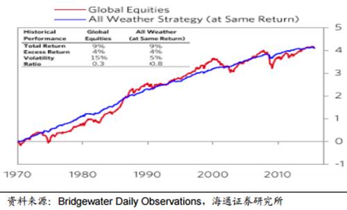 如果验证的话,那Bridgewater(桥水联合基金)的“全天候”策略就是个成功的实证。从下图可以看到,在收益率相同的情况下,全天候组合的净值曲线更加平稳与光滑,回撤也显著低于纯股组合。而从具体的统计数据可知,风险平价组合在将自身的波动率控制在纯股组合三分之一的同时,获得了与高风险的纯股组合相当的收益。