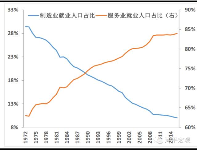 产业结构的变化首先带动的是就业结构的变化,制造业就业人口占比下滑。也就是说,中国的出口不是导致美国国内工业凋敝和失业增加的内在因素,产业结构变化带来的美国制造业外移才是根本原因。产业结构的变化也引起了贸易结构的升级。随着美国第三产业特别是服务业的发展和扩张,其服务贸易出口额的占比逐渐上升,而传统制造业的贸易则日渐萎缩。截至2016年9月,美国服务行业的就业人口占比高达84%。