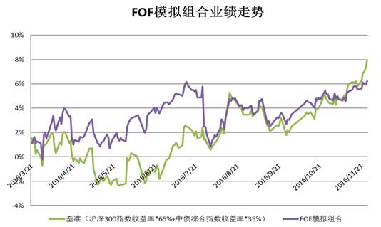 从绝对收益来看,上周大盘在蓝筹权重股的带动下上攻,“二八”现象演绎,指数涨幅较大但强势板块集中。我们的FOF模拟组合期内上涨0.67%,表现分别落后于上证综指和基准收益1.49%和1.32%。自推出以来,FOF模拟组合获得6.25%的正收益,落后于上证综指4.13%,相较于创业板指的超额收益为6.72%。我们的FOF组合以绝对收益为目标,权益仓位为0-95%,可参考市场上的灵活配置型基金的基准作为比较,与同期基准(沪深300指数收益率*65%+中债综合指数收益率*35%)相比,收益落后1.71%。