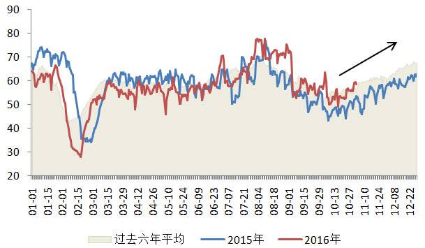 再从需求端来看,有没有可能后续由于需求下滑而导致现货价格回落呢?历史走势表明煤炭的需求侧有着很强的季节性。比如:夏季是用电高峰期,而六大发电厂的耗煤量恰恰位于年度较高水平;同理,冬季是供暖时期,发电厂的耗煤量亦会随之增加,当然,下图中的数据端也验证了我们的逻辑推理。所以从需求侧来看,随着冬季的来临,煤炭的需求量大概率会提升。