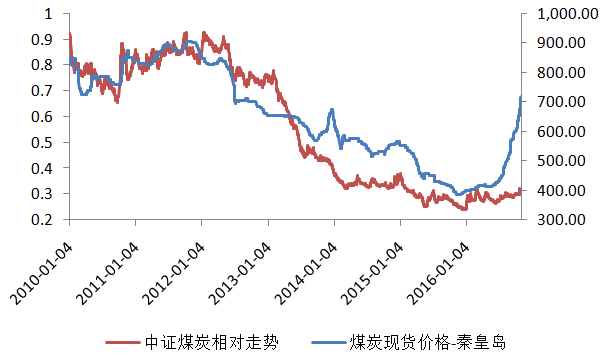 图:中证煤炭相对价格走势与现货价格走势相关性