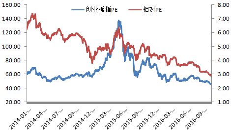 现在投资,人必言估值。从上轮牛市前2014年初算起,截至今日,创业板指PE已经下降至最低点45.42,较15年6月股灾前最高值137.85已跌去近70%。同时,相对于大盘的相对PE也已降至2.88倍。(数据来源:wind,截至2016-11-8)曾经高不可攀的创业板已经走入凡间,变得日趋平民了。