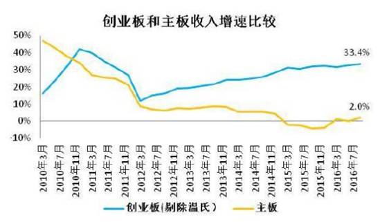 虽然没有一班大款多,但二班勤奋啊!三季度企业喜人的盈利增速为市场打了一阵定心剂。据广发证券所示,创业板的三季报收入增速为33.4%,相比一季报的32.7%进一步加速;三季报盈利增速为34.6 %,相比一季报的29.9%明显改善。从以下两图可以看出,创业板的收入趋势和盈利趋势都远好于主板。