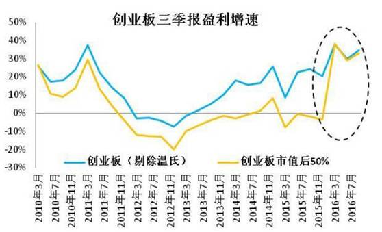 考试除了童鞋们个人名次的排序,还有班与班之间的暗自较劲,咳咳,这毕竟就关系到班主任奖金的问题了。这时候,班里的后进生就是重点受“关注”对象了。不过,今年创业板班里的后进生表现显然令人期待——创业板市值后50%公司的利润大幅加速。在2016年以前,创业板市值后50%的非权重股利润增速远远弱于创业板整体(2011-2015年,创业板市值后50%公司的利润增速几乎一致为负),但是从今年一季度开始,创业板非权重股的业绩增速出现大幅提升——创业板市值后50%公司的2015年利润增速为-3.8%,到今年三季报已上升至32.8%,和创业板整体几乎已经没有差距。