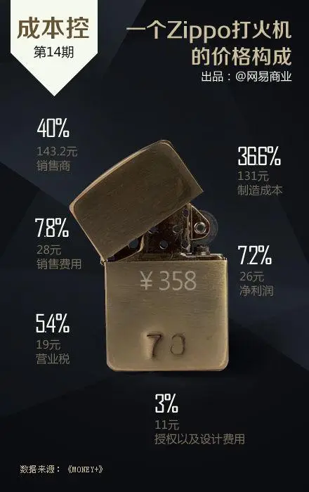 Zippo是通过代理和批发商销售,销售商毛利25%至40%。一个标价为358元的打火机,销售商可拿到的价格为214.8元,毛利在143.2元左右。Zippo的直接制造成本占产品售价36.6%约131元。实际上,Zippo所有产品都在美国本土生产,劳动力成本颇为高昂。成本高的另一原因型号众多,大规模生产并不能带来成本降低。
