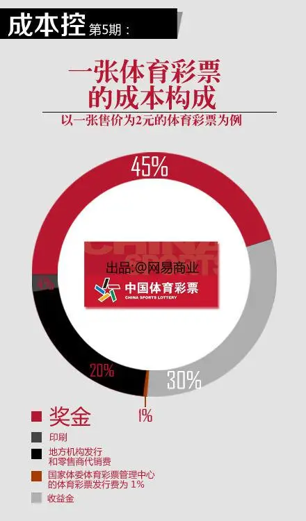 以一张售价为2元的体育彩票为例。45%,奖金,25%,发行成本,其中:(1)印制费为4%;(2)国家体委体育彩票管理中心的体育彩票发行费为 1%;(3)地方机构发行和零售商代销费为20%。30%,收益金。