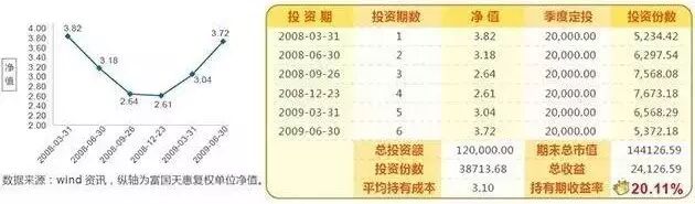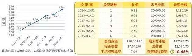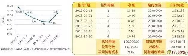 统计时间内,富国天惠净值走势为单边上涨,6期等额定投后,持有期收益率为10.48%,远低于直接买入的收益。所以牛市并不适合定投,在震荡市、连跌反弹市下,定投收益率远高于直接买入收益率。
