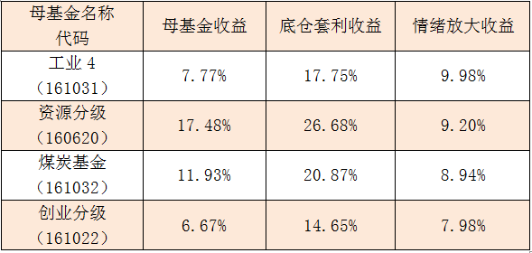 近期随着A股市场升温,投资者情绪也有改善,根据级掌柜统计,在板块表现较好的几只分级基金中,工业4B最受客官们的青睐,仅乐观情绪就带来了10%的收益;其次,资源B、煤炭B基、创业板的“情绪收益”也均在7%以上。