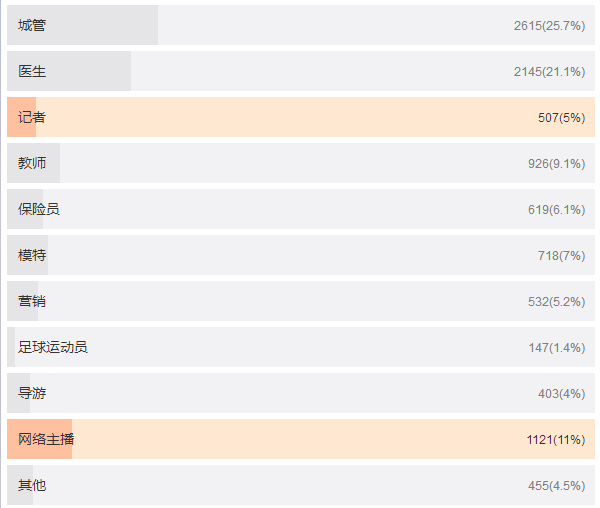 不过最委屈的还不是记者,截至27日上午11时,排名前三的职业分别是”城管“、”医生“、”网络主播“。
