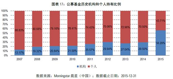 截至2015年年底,机构投资者持有的基金份额占比为56.29%,而个人投资者持有的基金份额占比为43.71%,较2014年末大幅下调。