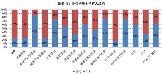 从各类别基金持有人结构来看,2015年机构投资者较偏向于持有保守混合型和激进债券型基金,这两个类别中机构持有者持有的基金规模占比分别为85%、77%。机构投资者持有普通债券型基金和纯债基金的基金规模占比也均达到70%以上。而对于个人投资者而言,2015年个人投资者较偏向于持有可转债基金、标准混合型基金、保本基金和QDII产品,这四类产品中个人投资者持有的基金规模占比均为75%以上。