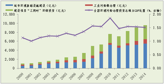 在过去的五年间,国家关于环境治理的投资,平均每年维持在八、九千亿的水平,“十二五”期间我国环境治理投资总额占GDP的比重约为1.5%。