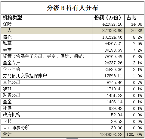 15年年报的数据显示,在前十大持有人份额中机构占到了近七成,个人投资者只占到三成。并且参与分级B的机构分布也非常广泛,所有参与分级A的各类型机构除P2P外均不同程度参与了B类,也有少数未在分级A持有者中出现的机构出现在了分级B上,比如政府机构、学校和会计师事务所。1.以往被认为只是分级A第一大主力机构的保险同样也是分级B的第一大主力,共持有42.3亿份分级B;