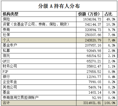 5.其余机构为第五大类主力,包括其它公司、QFII、财务公司、基金自营、社保、政府机构、学校和会计师事务所,占比均不到1%。其中QFII一家,为瑞士信贷(香港)有限公司。总体而言在前十大持有人份额中保险、散户及各交易型机构各占三成,呈三足鼎立之势,不过考虑到个人持有份额较分散,未上十大持有人数量较多,在总的分级B中占比应该会比在前十大持有人份额中所占比例更高。而各类型机构同时持有分级A和分级B的现象也反映出,这些机构其实是当做持有母基金并进行增强型套利(底仓套利)。可见底仓套利的玩法极具吸引力。一直知道机构挚爱分级A,但没想到竟爱到这种程度。从上表可以看到,机构持有者比重在前十大持有人中占比达到惊人的92.6%,而个人持仓仅占到7.4%。1.机构投资者中仍以保险为最主要投资者,几乎占据半壁江山,达49.3%;