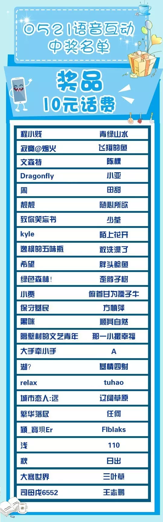 话不多说,先干正事:10元话费拿好啦!温馨提示:所有中奖的话费将于5月27日(本周五)之前充值到中奖客官的手机账户中,请客官们耐心等待~