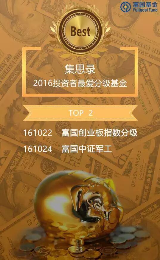 在长达两周、累计上万次的投票后,富国创业板指数分级(161022)以压倒性的2193票折得桂冠,富国中证军工(161024)以1804票居次,两只富国旗下极具代表性的分级基金共同谱写了一曲投资者最爱的篇章!之前,可能由于没有统一的评奖标准,所以分级基金界一直没有什么耀眼的官方大奖。每每年终盘点、大奖莅临,级掌柜只能艳羡的看着富国家其他产品满载大奖而归。今日,集思录这样一个屯集着一批专业、老练、谙熟分级基金各类投资技巧投资者的低风险投资理财社区给予了富国分级这样一份至高赞誉,让级掌柜倍感荣耀。因为这每一张选票背后写满的都是投资者们对富国分级的信任,记载的亦是投资者们对富国分级的喜爱与大力支持。