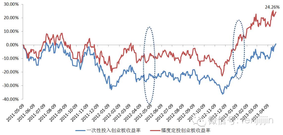 其次,解套时间大幅缩短,2013年初定投创业板就已经顺利解套,此时一次性投入的亏损还在-16%左右;