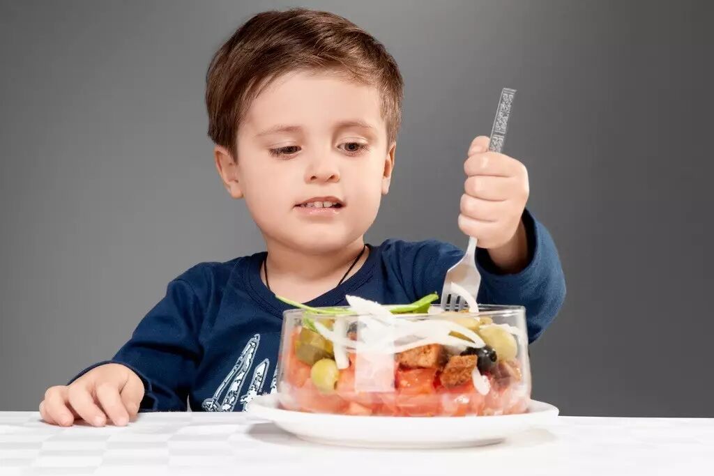 电视镜头:妈妈告诉小男孩怎么放刀叉,小男孩问:“可是吃的放哪里呢?”