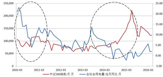 相反,在经济走强阶段,股市表现往往逊色不少。比如:2011年初,发电量大幅提升,中证500却直线下跌;还有2015年初的时光,中证500也是伴随着发电量的提升而出现了短暂回调。