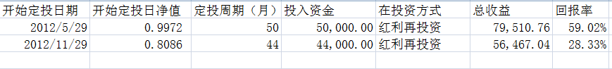 2012年5月开始的收益是58.02%,2012年11月开始定投的收益是28.33%。