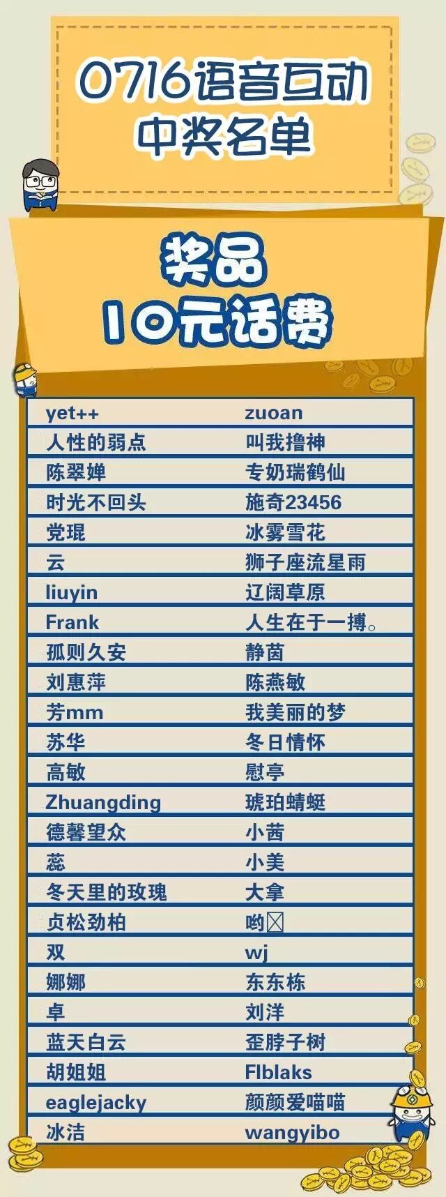 所有中奖的话费将于7月22日(本周五)前充值到中奖客官的手机账户中,请客官们耐心等待~