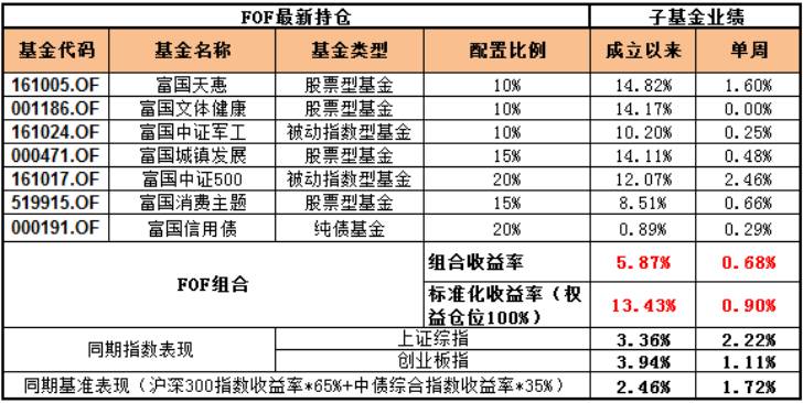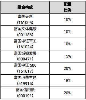 2、就子基金选择来看,在权益仓位100%的设定下,组合单周上涨0.9%,在40个可比组合中排名第22,其中,中小盘风格的宽基富国中证500排名第7;行业配置均衡、核心+卫星投资策略的天惠本期表现良好,排名处于上半区。此外,主题类基金文体健康和主题窄基中证军工,配置风格与近期热点契合度偏低,单周表现较落后,排名位于可比下半区。