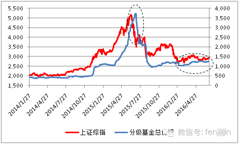 从上图不难看出,在市场暴跌初始,总是伴随着分级基金规模的剧增,而在下跌后期,分级份额缩减也是由下折导致的自然缩减;并且在当下的震荡行情中,分级基金的规模已有稳步上升的痕迹。而那些分级规模缩减之辞不过是由于下跌市中分级基金净值下跌导致罢了(基金规模=基金份额*单位净值)。