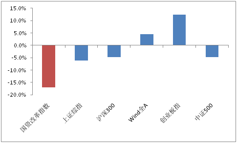 首先,国企改革和暴涨前的军工相似的地方是:之前跌的多。据级掌柜统计,自去年九月以来,国企改革一言不合就卧倒,在创业板、Wind全A还大幅上涨之时,国资改革指数就暴跌了17%。