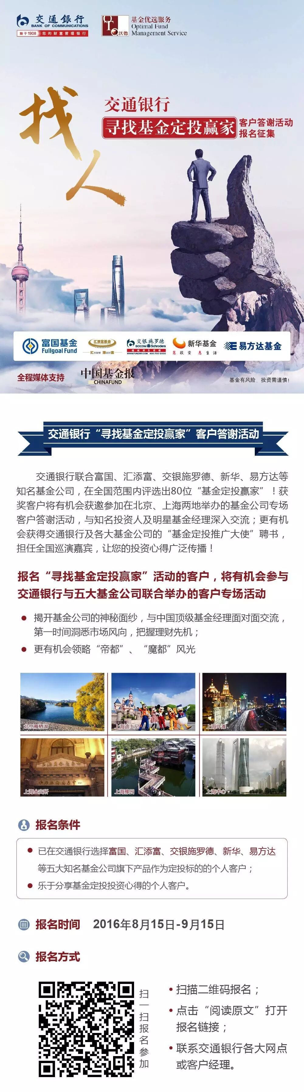 8月15日至9月15日期间,在交行各个网点、官网及手机银行通过扫描二维码,填写相关报名信息即可参与。富二也为客官准备了便捷通道——点击富国官网首页banner、或本页面左下“阅读全文”,即可跳转链接至详情报名页面。
