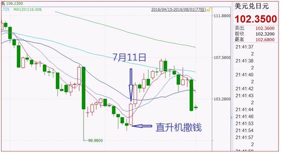 但是,突然日本央行说直升机撒钱了,也就是说日本要滥发货币了,日币要贬值了。瞬间,友谊的小船说翻就翻,日元大跌。这就是今年7月11日,美元兑日元大涨的走势原因。