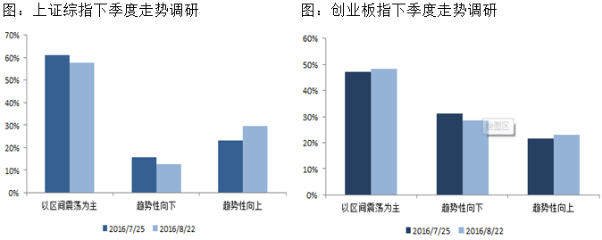 比如:上个月仅有23%的客官认为上证综指会持续上行,当下这个比例已经提升6%+至30%左右。而“跑票”的客官大部分集中在一个月前的“震荡走势”派。同样,认为创业板指继续涨的客官比例也略微提升2%左右;