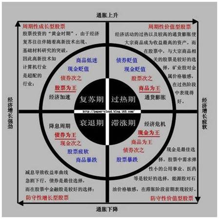 在经典的美林投资时钟里面,随着经济增长和物价的变化,经济会依次经历衰退、复苏、过热和滞胀四个周期,而最佳配置的资产会在债券、股票、商品和现金之间轮动。其中经济增长分成“好跟差”、物价分成“涨和跌”,组合起来刚好是四种变化。