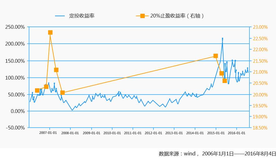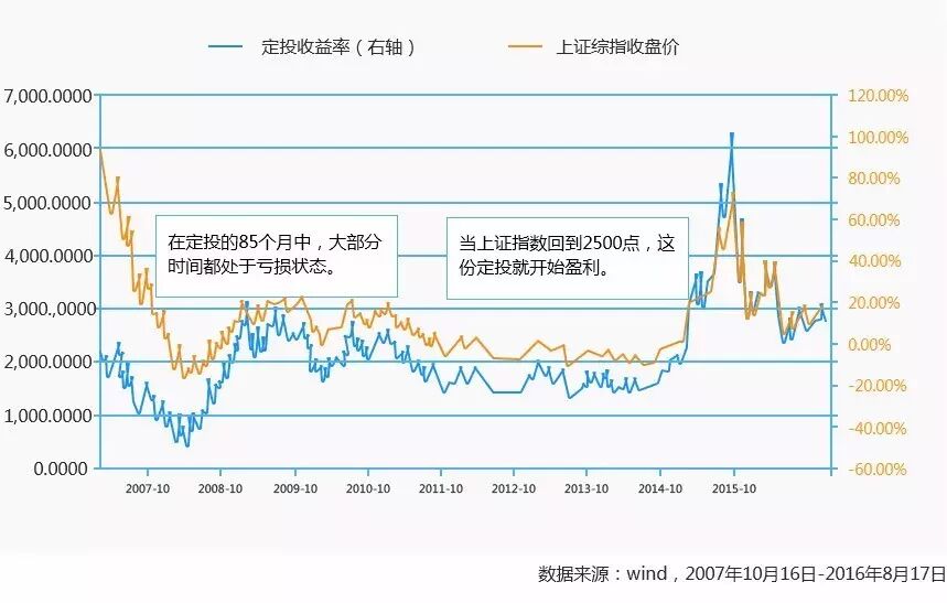 经过富二测算,如果投资者以上证综指为定投标的,每月16日按照上证综指收盘价定投1000元,就算在市场最高点6142点开始定投,坚持到现在,他的账户不会雪崩还会有较高收益,这靠的就是在长期熊市中积累的大量便宜筹码。