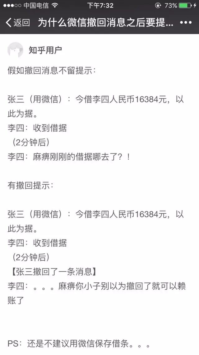 另外,在一些商务谈判或者借贷等特定场合,如果撤回信息无文字提示,则将会导致对方利益受到损失。比如知乎网友提到的借贷问题: