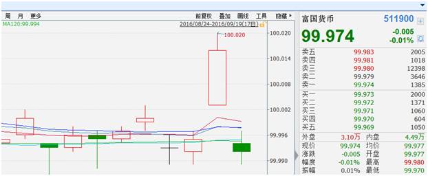 以2016年9月12日(周一)和中秋节前最后一天9月14日(周三)两天计算,其中9月12日的收盘价为99.993元,9月14日收盘价为100.016元,按照目前日均交易量30万手来算,那么场内投资者周一的累计交易成本较周三(节前最后一个交易日)可节省96万元(不包含托管费和管理费)。