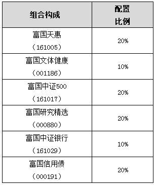 我们在个基选择上仍注重均衡配置以提高组合风险收益比;同时以风格类宽基搭配互补为主并配置波段交易型的窄基以增强收益,实现主动和被动基金的双轮驱动。目前,我们的最新推荐为“20%天惠+10%文体健康+20%中证500+20%研究精选+10%中证银行+20%富国信用债” 。
