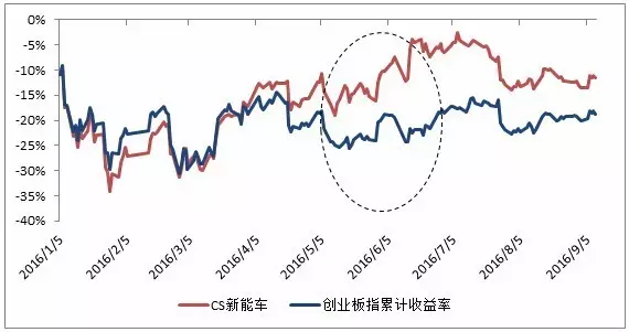 数据来源:Wind资讯 日期:2015年1月——2016年7月并且这期间,新能源车板块也在这样萎靡的行情世道中,惊现一波又一波独立而又精彩的上涨行情。