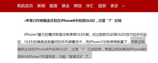 对于昨夜的iPhone7,熬夜观看的投资者最大的槽点就是没有使用OLED屏。iPhone7没有使用就算了,有报道显示,“苹果还明确表达将在iPhone8中应用OLED,过渡‘7’已成定局,更是让网友期待iPhone8的同时对iPhone7失望到底,只能‘留肾买8’了。”