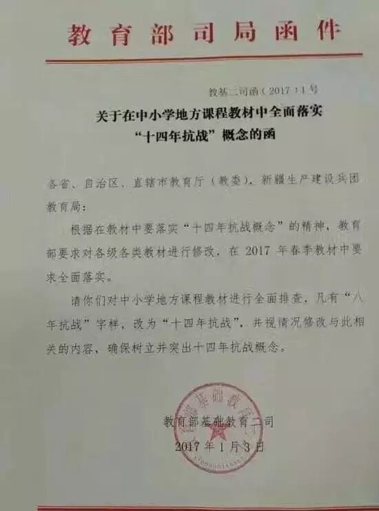 近日,教育部下发2017年1号函件《关于在中小学地方课程教材中全面落实“十四年抗战”概念的函》(以下称为《函件》)。1月10日,教育部基础二司证实该通知确实由他们所发。目前2017年春季教材已全面落实。