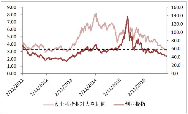 创业板接着跌,在收归第七根阴线时,还踩了把油门,加了个速。反正跌到现在,那总被市场诟病的创业板估值,无论是绝对估值水平还是其相对大盘的估值水平,都已经接近了2011年以来的低位。