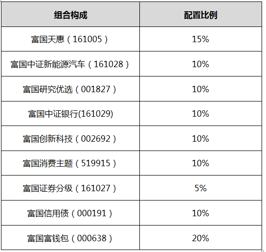 节后一周如期迎来上涨,首日开盘上证综指一举突破3400点位,虽后续指数有所回落,但在无显著政策利空以及企业盈利仍缓慢改善的背景下,市场震荡向上的格局并未结束。我们坚持弱化择时,坚持“高景气度、高风险收益比”的配置原则,力求在不放大风险的情况下获取确定性较高的绝对收益。本周基于组合整体的风险收益比优化,我们卖出5%的富国证券分级,买入5%的富国消费主题,同时结合债券资产与货币资产的比价效应,卖出10%的富国信用债,买入10%的富国富钱包,目前最新推荐组合为“15%天惠+10%富国中证新能源汽车+10%富国中证银行+10%研究优选+5%富国证券分级+10%创新科技+10%富国消费主题+10%富国信用债+20%富国富钱包”。